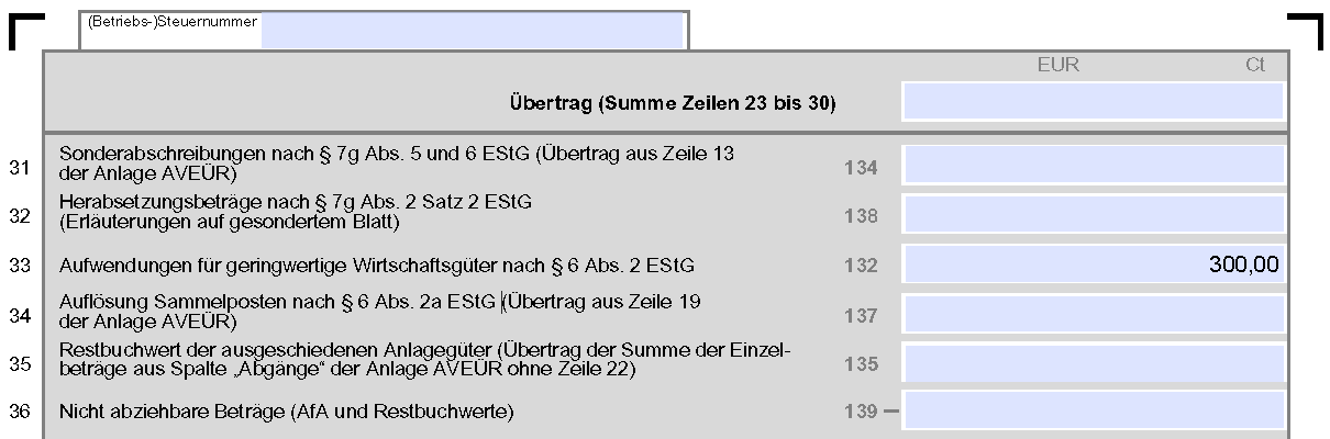 Willst du Sofortabschreibungen in deiner Steuererklärung berücksichtigen, ist dabei Zeile 33 der EÜR die richtige für dich. Du kannst beispielsweise das Netbook für 300,00 € als Sofortabschreibung behandeln. In diesem Fall trägst du einfach die 300,00 € in Zeile 33 ein.