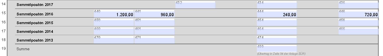 Angenommen, du hast diese Wirtschaftsgüter in 2020 angeschafft und bereits die 960,00 € abgeschrieben, trägst du diese in Zeile 15 ein. Dann sind die 1.200,00 € die Anschaffungskosten zum Zeitpunkt der Anschaffung, die 960,00 € sind der Buchwert zu Beginn des Gewinnermittlungszeitraums und der auflösungsbetrag beträgt erneut 240,00 €. Der Buchwert am Ende des Kalenderjahres 2021 wird in die letzte Spalte von Zeile 15 „Sammelposten 2019“ eingetragen und beträgt nun 720,00 €.