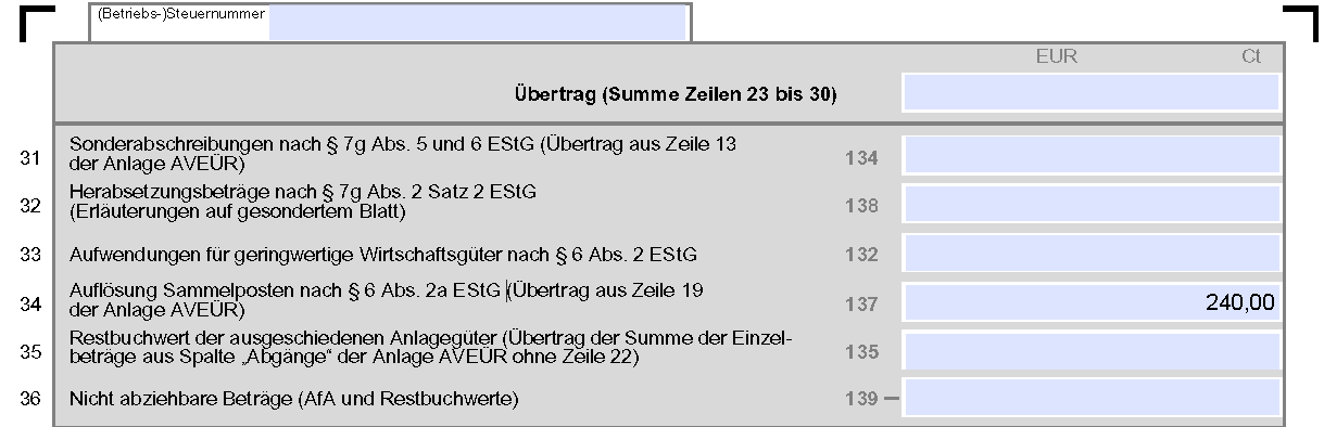 Die Summe der Abschreibungen bzw. Pool-Auflösungen fasst du in Zeile 19 der AVEÜR zusammen. Dann wird diese Summe in der EÜR in Zeile 34 angegeben.