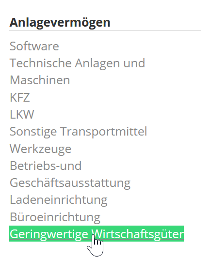 Du kannst also entweder einen Sammelposten bilden und darin alle Wirtschaftsgüter zwischen 250,00 € und 1.000,00 € erfassen, oder dich für die Sofortabschreibung entscheiden.