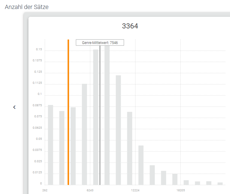 Der Genre-Mittelwert allgemeiner Belletristik beträgt 7546 Sätze. Mit guten 40.000 Worten ist „Die Krankheitensammlerin“ allerdings ein Kurzroman. Hier zeigt sich, wie wir LiSA von Qualificiton behandeln sollen: Wir sollen die Ergebnisse mit unseren Erwartungen vergleichen. Hier trifft der Wert, den LiSA mir zeigt, zu und ist gut, obwohl ich weit vom Genre-Mittelwert entfernt bin.