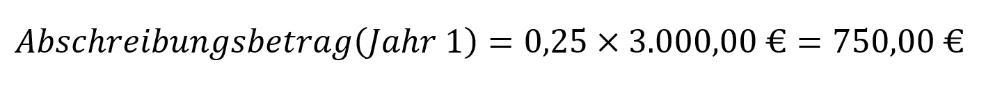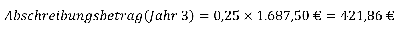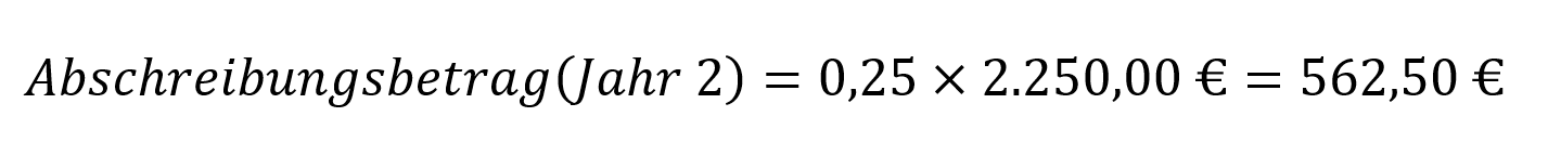 Im zweiten Jahr nehmen wir den Restbuchwert, den wir im ersten Jahr durch unsere degressive Abschreibung ermittelt haben. Von diesem Restbuchwert ziehen wir wieder 25 % ab und erhalten den Restbuchwert, der im nächsten Wirtschaftsjahr Grundlage für die degressive Abschreibung bildet.