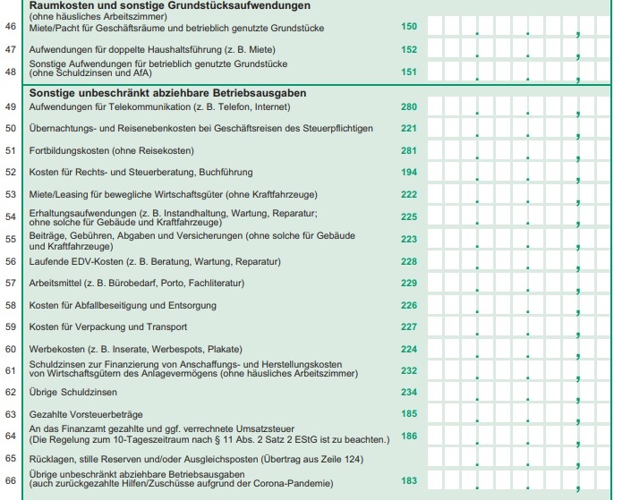 Solltest du dir doch ein Büro oder ähnliches ausschließlich für deine Tätigkeit mieten, so kommen die Ausgaben in Zeile 46. Als kleinunternehmender Autor unterstellen wir dir, dass du Zeile 47 und 48 ignorieren kannst.