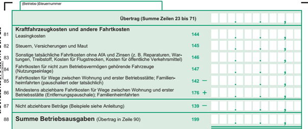 Zähle deine Betriebsausgaben (nicht Übertrag von Zeilen 23 bis 31 vergessen!) zusammen und trage sie in Zeile 88 ein.