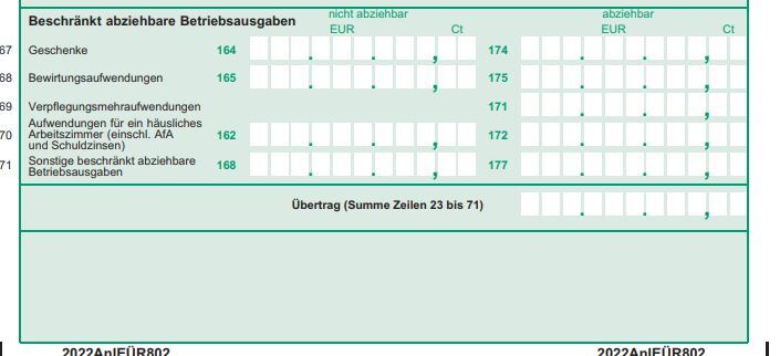 Zeile 67: Wenn du einem Geschäftsfreund ein Buch schenkst, so ist das rechts in der Zeile „abziehbar“ anzugeben. Wenn du diesem Freund in einem Kalenderjahr ein Buch und einen Kinogutschein geschenkt hast, wird es schwierig: Wenn du brutto (Brutto weil Kleinunternehmer) mehr als 35 Euro ausgegeben hast, ist die gesamte Schenkerei an diesen Geschäftsfreund nicht abziehbar. Du darfst pro Geschäftsfreund also nur 35 Euro pro Jahr ausgeben, um diese Kosten hier abziehen zu können. Nachzulesen ist das in § 3 Abs. 5 Nr. 1 EStG.