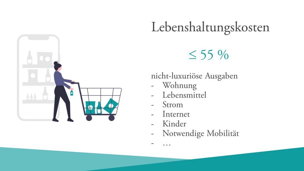 Alle diese nicht-luxuriösen Lebenshaltungskosten sollen weniger oder maximal 55 % deiner Kosten betragen.