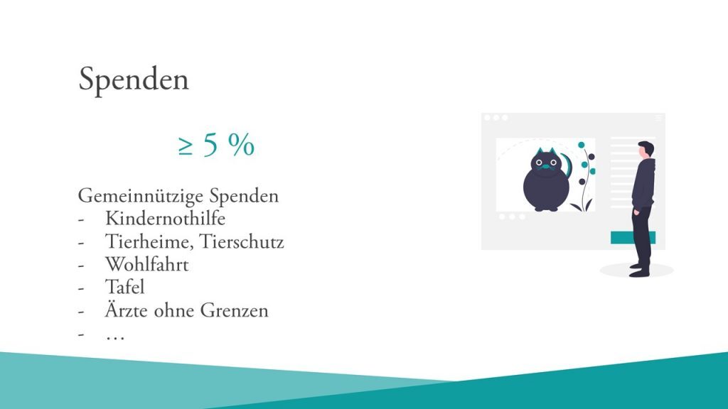 Gemeinnützige Spenden sind zum Beispiel die Kindernothilfe, Tierheime, Tierschutzorganisationen, die Wohlfahrt, Tafeln, Ärzte ohne Grenzen usw. Es gibt eine Menge Möglichkeiten. Du kannst da deinen persönlichen Präferenzen und deinem Herzen folgen und an so viele Organisationen spenden, wie du möchtest. Hauptsache ist, dass du dich ungefähr an die 5 % hältst.