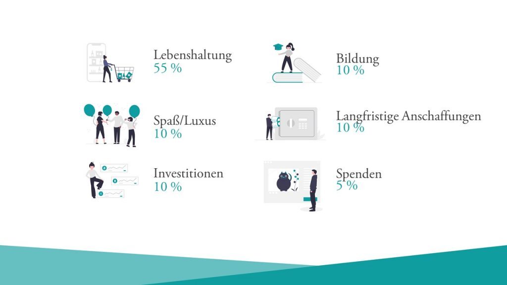 Für die Lebenshaltungskosten solltest du eine Budgetierung vornehmen. Es gibt zahlreiche Quellen, die die 5-Konten-Methode wie folgt zusammenfasst: