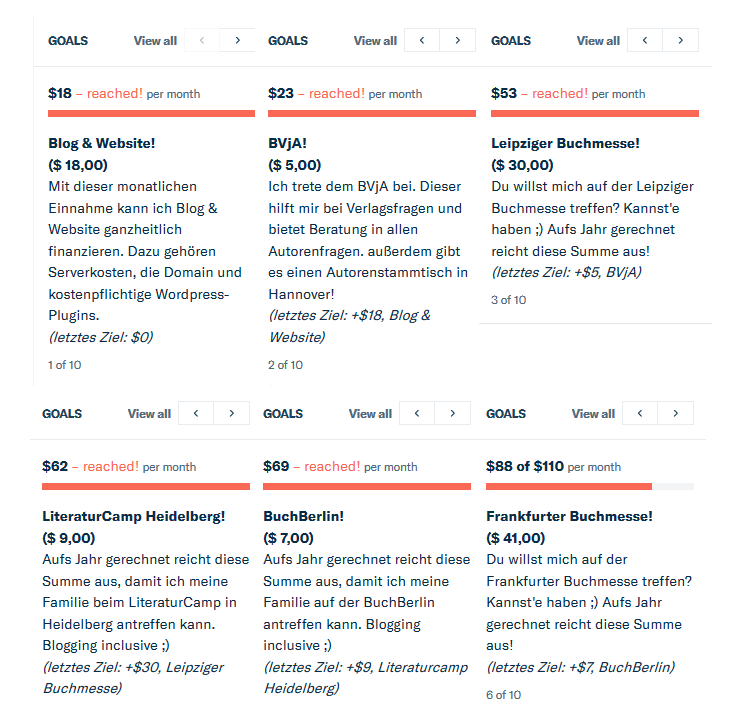 Die meisten Creators auf Patreon wollen ein Einkommen aufbauen und von ihrer Arbeit als Autor oder Schriftsteller leben können. Da ich aber im Prinzip niemandes Lebensunterhalt im Privaten finanzieren möchte, habe ich das auch meinen Patrons unterstellt und kostendeckende Ziele erstellt. Das Geld, das ich bekomme, ist demnach nicht für mich als Privatperson, sondern für mich als Selbstständige. Ich lasse mir von meinen Unterstützern beispielsweise die Server- und Domainkosten dieses Blogs finanzieren. Somit arbeite ich hier „nur noch“ kostenlos an Autoren an die Steuer und Blogartikeln wie diesem hier und zahle wenigstens nicht mehr drauf. Auch Reisen wie die Leipziger Buchmesse, die BuchBerlin oder mein Mitgliedsbeitrag im BVjA wird durch die Einnahmen über meine Patreon-Seite gedeckt.