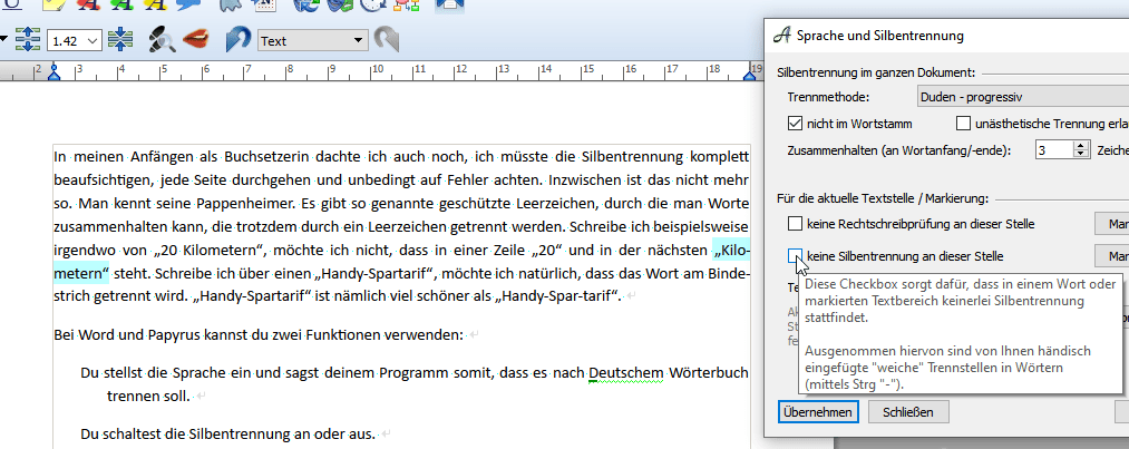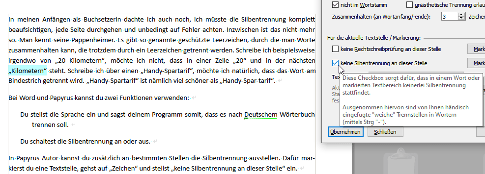 In Papyrus Autor kannst du zusätzlich an bestimmten Stellen die Silbentrennung ausstellen. Dafür markierst du eine Textstelle, gehst über „Zeichen“ auf „Sprache und Silbentrennung“ und stellst „keine Silbentrennung an dieser Stelle“ ein.