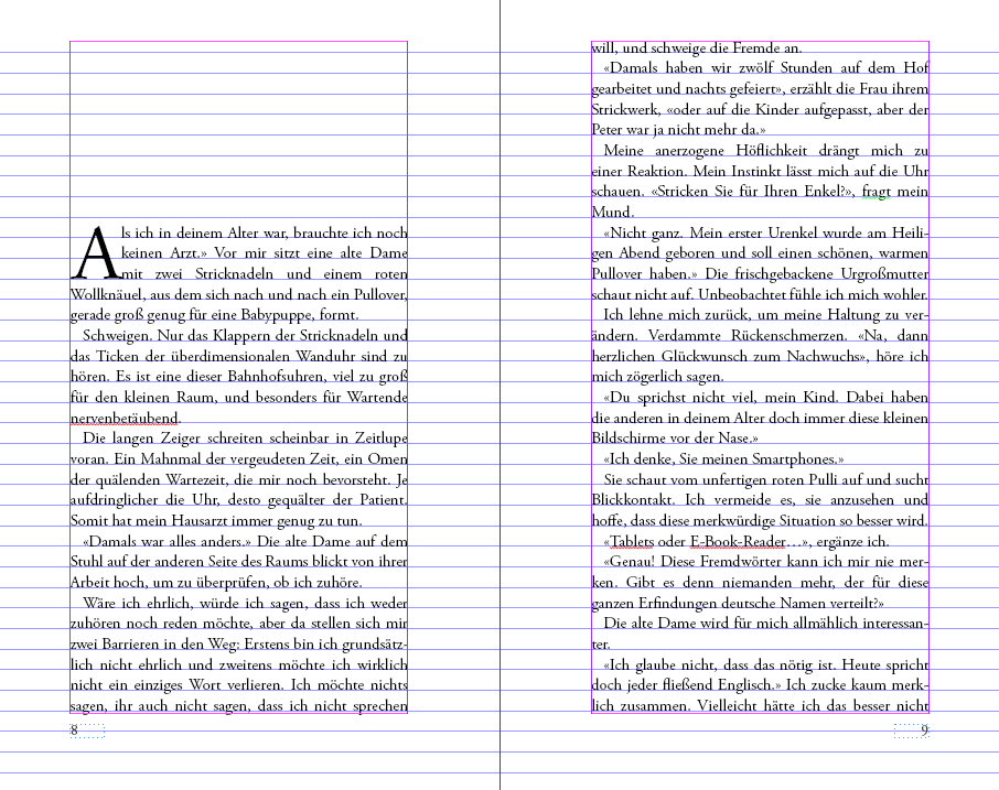 Einer der Hauptgründe, warum ich ungesetzte Bücher auf den ersten Blick erkenne, ist das Grundlinienraster. So bezeichnet man die fiktiven Linien, sozusagen den einheitlichen Zeilenabstand, die horizontal auf einer Papierseite stehen.