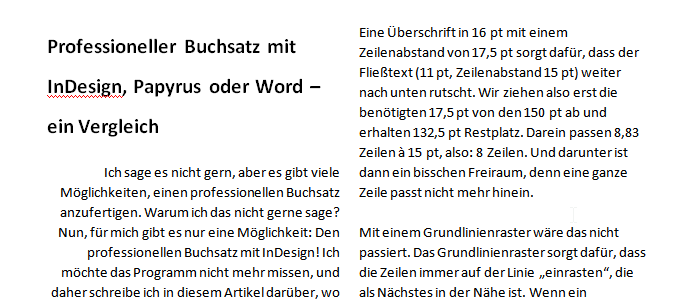 Die einzige Möglichkeit, in Word oder Papyrus an die Vorteile eines Grundlinienrasters zu gelangen, ist, wenn deine Überschriften und abweichenden Absatzformate ein Vielfaches der Zeilenhöhe deines Fließtextes sind. Stellst du also für die 16-pt-Überschrift einen Zeilenabstand von genau 24,4 pt ein, hast du ein Vielfaches der 15 pt und somit keine Verrückungen.