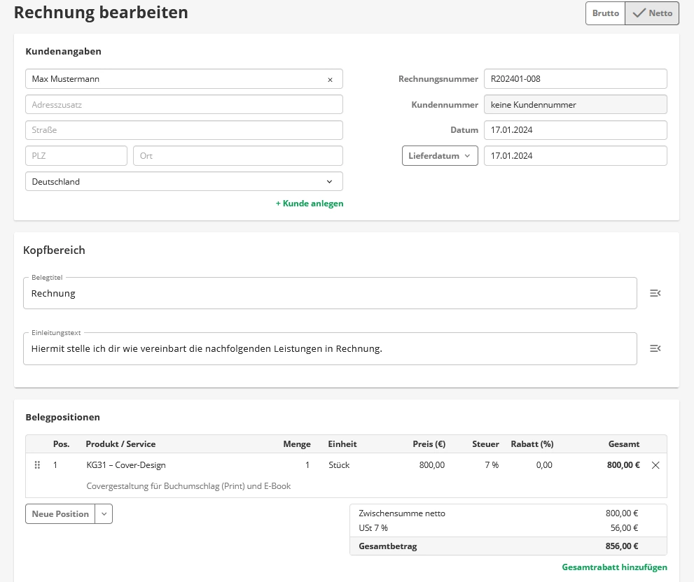 Bei einer bereits verbuchten Rechnung musst du zuerst die vorherige Rechnung stornieren und dann eine neue Rechnung erstellen.