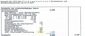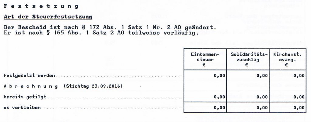 Zunächst gleichst du die zu zahlende Einkommensteuer mit dem ab, was du erwartet hast. Durch deine Steuererklärung kommst du rechnerisch selbst auf ein zu versteuerndes Einkommen, das dir auch das ELSTER-Programm mitteilt. Anhand dieses Wertes kannst du grob überschlagen, welche Steuer auf dich zukommt. Beim Anfertigen der Steuererklärung für den Veranlagungszeitraum 2015 wusste KIa, dass sie keine Steuern zahlen muss. Auch auf dem Bescheid war ein Betrag von 0,00 € angegeben. So weit, so gut.