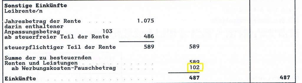 Hier ist es wichtig, auf die 102,00 Euro pauschale Werbungskosten zu achten. Auch wenn in ihrem Fall gar keine Werbungskosten im Zusammenhang mit der Rente entstanden sind, fügt das Finanzamt diesen Betrag automatisch hinzu. Den Werbungskosten-Pauschbetrag gibt es beispielsweise für „Vollzeit-Rentner“, die geringe Kosten haben, um zum Finanzamt zu fahren, ihre Steuererklärung zu erstellen, und ein bisschen Papier, Drucker oder ähnliches brauchen. Das verringert im Prinzip die Bürokratie und spielte Kia bei ihrem Steuerbescheid in die Karten. Was bei ihren 89,59 Euro Bruttorente allerdings eh unerheblich ist. Aber angeben muss man natürlich trotzdem alles 😉