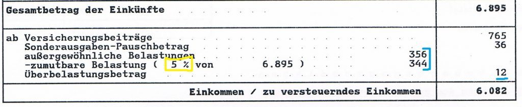 Für Kia als alleinstehende Kinderlose mit einem Jahreseinkommen von weniger als 15.340,00 Euro gelten 5 % des Einkommens als zumutbar. Alle außergewöhnlichen Belastungen, die über diese 5 % hinausgehen, werden als für die Einkommensteuer relevant vom Gesamtbetrag der Einkünfte abgezogen. In Kias Fall waren das 12,00 Euro, die sie an Medikamentenkosten über diesem Betrag hatte und die Einnahmen wurden entsprechend gesenkt. Schaue in der nachfolgenden Tabelle nach, ob dein Prozentsatz richtig angegeben wurde.