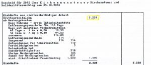 Überprüfe, ob der Arbeitnehmer-Pauschbetrag von 1.000,00 Euro als Werbungskosten berücksichtigt wurde, falls deine tatsächlichen Ausgaben weniger als 1.000,00 Euro betragen. In Kias Fall kam sie unter den Betrag (und hätte sich die ganze Arbeit streng genommen nicht machen müssen) und so auf ein Jahreseinkommen aus abhängiger Beschäftigung im Steuerbüro von 2.228,00 Euro.