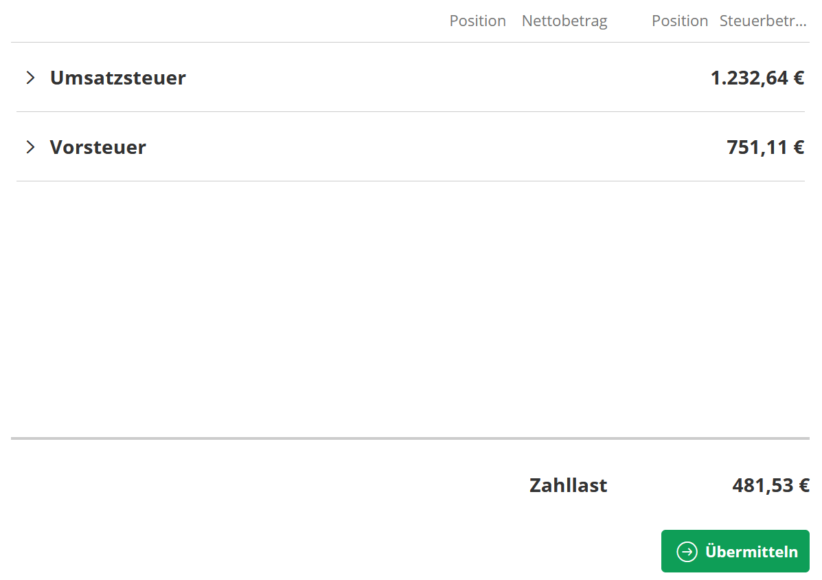 Übrigens: Mit Lexoffice erledigst du die Umsatzsteuervoranmeldung mit nur einem Klick auf „Übermitteln“ in der entsprechenden Ansicht. Die Buchhaltungssoftware rechnet mit und kommuniziert mit dem Finanzamt. Du musst dann nichts mehr tun!